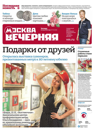 «Вечерняя Москва» — ежедневная российская вечерняя газета, старейшее из вечерних изданий в России, учрежденное в 1923 году. Выходит пять дней в неделю, кроме субботы и воскресенья. Отличается тем, что рассказывает о событиях еще не завершившегося дня. Оперативно освещает хронику и особенности жизни Москвы, охватывает все слои общества и большинство профессиональных и возрастных групп читателей.Издание представлено тремя выпусками – утренним ежедневным, вечерним (выходит три раза в неделю), еженедельным (выходит по четвергам).