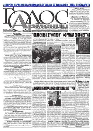 Общественно-политическое издание "Голос Армении" выходит с мая 1991 года и является наиболее популярной, авторитетной и цитируемой русскоязычной газетой страны. Спектр затрагиваемых проблем - самый широкий: от политики и экономики до культуры и социальных сетей, а авторы "Голоса Армении" по праву составляют золотой фонд современной армянской журналистики.
