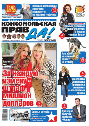 Многостраничный выпуск «Комсомольской правды», который выходит еженедельно по пятницам. Основные рубрики «КП – толстушки»: «Беседка «КП», «Дурилка «КП», «Клубный пиджак», «Антиреклама», «Окно в природу», «Россия, вперед», «Светская жизнь», детская страничка и так далее. Спецпроекты еженедельника «Комсомольская правда (толстушка)»: «КП» - здоровье» (народные рецепты здоровья и, конечно же, консультации и советы профессиональных эскулапов); «Моя дача» (если у вас есть приусадебный участок, возникает вопрос, как его грамотно обустроить и собрать с нескольких соток богатый урожай); «Телевизор «КП» (все, что вы хотите знать о телевидении, шоу-бизнесе, любимых сериалах, актерах, телеведущих, а также о закулисной тележизни) и многое другое.