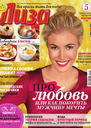 Самый популярный в России еженедельный журнал для молодых женщин «Лиза» стал еще интереснее, еще привлекательнее для читательниц. Теперь больше знаменитостей на страницах любимого журнала! Фитнес со звездой и звездный макияж, уроки стиля и самые горячие новости из жизни кумиров. А еще — модный шопинг, актуальная мода, новинки косметики и великолепные идеи для дома. Романтические истории о настоящей любви и рассказы читательниц о разных жизненных ситуациях. Аспекты психологии, секреты успешных отношений с окружающими и искусство сохранения любви.