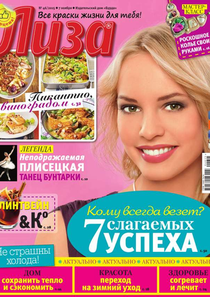 Самый популярный в России еженедельный журнал для молодых женщин «Лиза» стал еще интереснее, еще привлекательнее для читательниц. Теперь больше знаменитостей на страницах любимого журнала! Фитнес со звездой и звездный макияж, уроки стиля и самые горячие новости из жизни кумиров. А еще — модный шопинг, актуальная мода, новинки косметики и великолепные идеи для дома. Романтические истории о настоящей любви и рассказы читательниц о разных жизненных ситуациях. Аспекты психологии, секреты успешных отношений с окружающими и искусство сохранения любви.