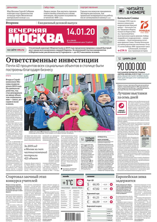 «Вечерняя Москва» — ежедневная российская вечерняя газета, старейшее из вечерних изданий в России, учрежденное в 1923 году. Выходит пять дней в неделю, кроме субботы и воскресенья. Отличается тем, что рассказывает о событиях еще не завершившегося дня. Оперативно освещает хронику и особенности жизни Москвы, охватывает все слои общества и большинство профессиональных и возрастных групп читателей.Издание представлено тремя выпусками – утренним ежедневным, вечерним (выходит три раза в неделю), еженедельным (выходит по четвергам).