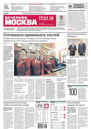 «Вечерняя Москва» — ежедневная российская вечерняя газета, старейшее из вечерних изданий в России, учрежденное в 1923 году. Выходит пять дней в неделю, кроме субботы и воскресенья. Отличается тем, что рассказывает о событиях еще не завершившегося дня. Оперативно освещает хронику и особенности жизни Москвы, охватывает все слои общества и большинство профессиональных и возрастных групп читателей.Издание представлено тремя выпусками – утренним ежедневным, вечерним (выходит три раза в неделю), еженедельным (выходит по четвергам).