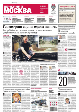 «Вечерняя Москва» — ежедневная российская вечерняя газета, старейшее из вечерних изданий в России, учрежденное в 1923 году. Выходит пять дней в неделю, кроме субботы и воскресенья. Отличается тем, что рассказывает о событиях еще не завершившегося дня. Оперативно освещает хронику и особенности жизни Москвы, охватывает все слои общества и большинство профессиональных и возрастных групп читателей.Издание представлено тремя выпусками – утренним ежедневным, вечерним (выходит три раза в неделю), еженедельным (выходит по четвергам).