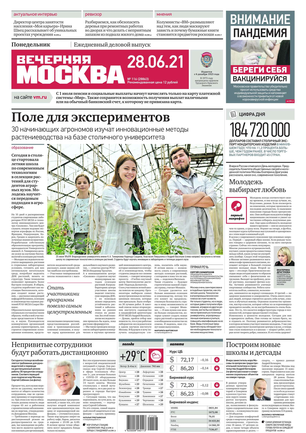 «Вечерняя Москва» — ежедневная российская вечерняя газета, старейшее из вечерних изданий в России, учрежденное в 1923 году. Выходит пять дней в неделю, кроме субботы и воскресенья. Отличается тем, что рассказывает о событиях еще не завершившегося дня. Оперативно освещает хронику и особенности жизни Москвы, охватывает все слои общества и большинство профессиональных и возрастных групп читателей.Издание представлено тремя выпусками – утренним ежедневным, вечерним (выходит три раза в неделю), еженедельным (выходит по четвергам).