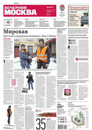 «Вечерняя Москва» — ежедневная российская вечерняя газета, старейшее из вечерних изданий в России, учрежденное в 1923 году. Выходит пять дней в неделю, кроме субботы и воскресенья. Отличается тем, что рассказывает о событиях еще не завершившегося дня. Оперативно освещает хронику и особенности жизни Москвы, охватывает все слои общества и большинство профессиональных и возрастных групп читателей.Издание представлено тремя выпусками – утренним ежедневным, вечерним (выходит три раза в неделю), еженедельным (выходит по четвергам).