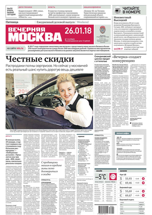 «Вечерняя Москва» — ежедневная российская вечерняя газета, старейшее из вечерних изданий в России, учрежденное в 1923 году. Выходит пять дней в неделю, кроме субботы и воскресенья. Отличается тем, что рассказывает о событиях еще не завершившегося дня. Оперативно освещает хронику и особенности жизни Москвы, охватывает все слои общества и большинство профессиональных и возрастных групп читателей.Издание представлено тремя выпусками – утренним ежедневным, вечерним (выходит три раза в неделю), еженедельным (выходит по четвергам).