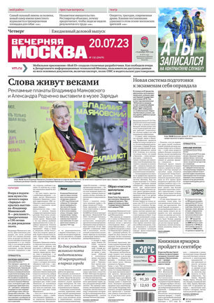 «Вечерняя Москва» — ежедневная российская вечерняя газета, старейшее из вечерних изданий в России, учрежденное в 1923 году. Выходит пять дней в неделю, кроме субботы и воскресенья. Отличается тем, что рассказывает о событиях еще не завершившегося дня. Оперативно освещает хронику и особенности жизни Москвы, охватывает все слои общества и большинство профессиональных и возрастных групп читателей.Издание представлено тремя выпусками – утренним ежедневным, вечерним (выходит три раза в неделю), еженедельным (выходит по четвергам).