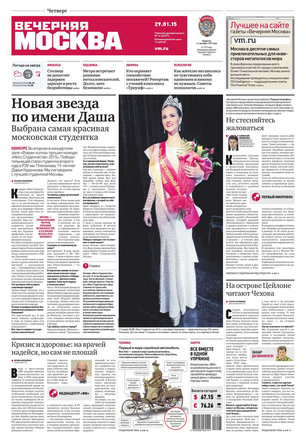 «Вечерняя Москва» — ежедневная российская вечерняя газета, старейшее из вечерних изданий в России, учрежденное в 1923 году. Выходит пять дней в неделю, кроме субботы и воскресенья. Отличается тем, что рассказывает о событиях еще не завершившегося дня. Оперативно освещает хронику и особенности жизни Москвы, охватывает все слои общества и большинство профессиональных и возрастных групп читателей.Издание представлено тремя выпусками – утренним ежедневным, вечерним (выходит три раза в неделю), еженедельным (выходит по четвергам).