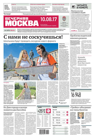 «Вечерняя Москва» — ежедневная российская вечерняя газета, старейшее из вечерних изданий в России, учрежденное в 1923 году. Выходит пять дней в неделю, кроме субботы и воскресенья. Отличается тем, что рассказывает о событиях еще не завершившегося дня. Оперативно освещает хронику и особенности жизни Москвы, охватывает все слои общества и большинство профессиональных и возрастных групп читателей.Издание представлено тремя выпусками – утренним ежедневным, вечерним (выходит три раза в неделю), еженедельным (выходит по четвергам).