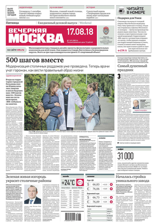 «Вечерняя Москва» — ежедневная российская вечерняя газета, старейшее из вечерних изданий в России, учрежденное в 1923 году. Выходит пять дней в неделю, кроме субботы и воскресенья. Отличается тем, что рассказывает о событиях еще не завершившегося дня. Оперативно освещает хронику и особенности жизни Москвы, охватывает все слои общества и большинство профессиональных и возрастных групп читателей.Издание представлено тремя выпусками – утренним ежедневным, вечерним (выходит три раза в неделю), еженедельным (выходит по четвергам).