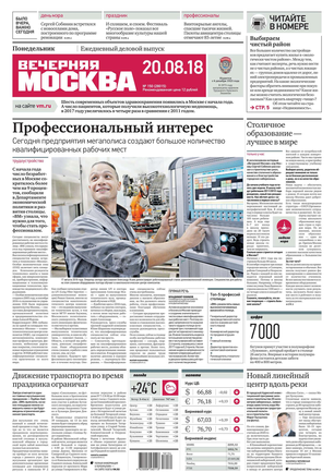 «Вечерняя Москва» — ежедневная российская вечерняя газета, старейшее из вечерних изданий в России, учрежденное в 1923 году. Выходит пять дней в неделю, кроме субботы и воскресенья. Отличается тем, что рассказывает о событиях еще не завершившегося дня. Оперативно освещает хронику и особенности жизни Москвы, охватывает все слои общества и большинство профессиональных и возрастных групп читателей.Издание представлено тремя выпусками – утренним ежедневным, вечерним (выходит три раза в неделю), еженедельным (выходит по четвергам).