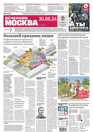 «Вечерняя Москва» — ежедневная российская вечерняя газета, старейшее из вечерних изданий в России, учрежденное в 1923 году. Выходит пять дней в неделю, кроме субботы и воскресенья. Отличается тем, что рассказывает о событиях еще не завершившегося дня. Оперативно освещает хронику и особенности жизни Москвы, охватывает все слои общества и большинство профессиональных и возрастных групп читателей.Издание представлено тремя выпусками – утренним ежедневным, вечерним (выходит три раза в неделю), еженедельным (выходит по четвергам).