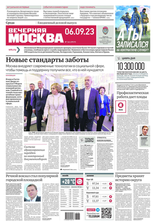 «Вечерняя Москва» — ежедневная российская вечерняя газета, старейшее из вечерних изданий в России, учрежденное в 1923 году. Выходит пять дней в неделю, кроме субботы и воскресенья. Отличается тем, что рассказывает о событиях еще не завершившегося дня. Оперативно освещает хронику и особенности жизни Москвы, охватывает все слои общества и большинство профессиональных и возрастных групп читателей.Издание представлено тремя выпусками – утренним ежедневным, вечерним (выходит три раза в неделю), еженедельным (выходит по четвергам).