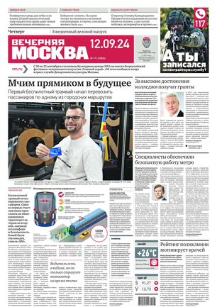 «Вечерняя Москва» — ежедневная российская вечерняя газета, старейшее из вечерних изданий в России, учрежденное в 1923 году. Выходит пять дней в неделю, кроме субботы и воскресенья. Отличается тем, что рассказывает о событиях еще не завершившегося дня. Оперативно освещает хронику и особенности жизни Москвы, охватывает все слои общества и большинство профессиональных и возрастных групп читателей.Издание представлено тремя выпусками – утренним ежедневным, вечерним (выходит три раза в неделю), еженедельным (выходит по четвергам).