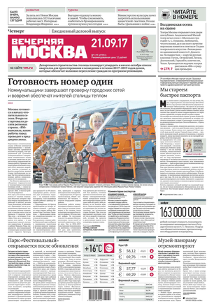 «Вечерняя Москва» — ежедневная российская вечерняя газета, старейшее из вечерних изданий в России, учрежденное в 1923 году. Выходит пять дней в неделю, кроме субботы и воскресенья. Отличается тем, что рассказывает о событиях еще не завершившегося дня. Оперативно освещает хронику и особенности жизни Москвы, охватывает все слои общества и большинство профессиональных и возрастных групп читателей.Издание представлено тремя выпусками – утренним ежедневным, вечерним (выходит три раза в неделю), еженедельным (выходит по четвергам).
