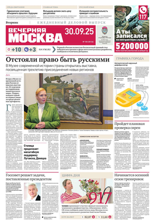 «Вечерняя Москва» — ежедневная российская вечерняя газета, старейшее из вечерних изданий в России, учрежденное в 1923 году. Выходит пять дней в неделю, кроме субботы и воскресенья. Отличается тем, что рассказывает о событиях еще не завершившегося дня. Оперативно освещает хронику и особенности жизни Москвы, охватывает все слои общества и большинство профессиональных и возрастных групп читателей.Издание представлено тремя выпусками – утренним ежедневным, вечерним (выходит три раза в неделю), еженедельным (выходит по четвергам).