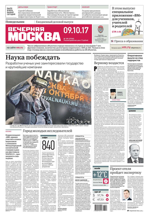 «Вечерняя Москва» — ежедневная российская вечерняя газета, старейшее из вечерних изданий в России, учрежденное в 1923 году. Выходит пять дней в неделю, кроме субботы и воскресенья. Отличается тем, что рассказывает о событиях еще не завершившегося дня. Оперативно освещает хронику и особенности жизни Москвы, охватывает все слои общества и большинство профессиональных и возрастных групп читателей.Издание представлено тремя выпусками – утренним ежедневным, вечерним (выходит три раза в неделю), еженедельным (выходит по четвергам).