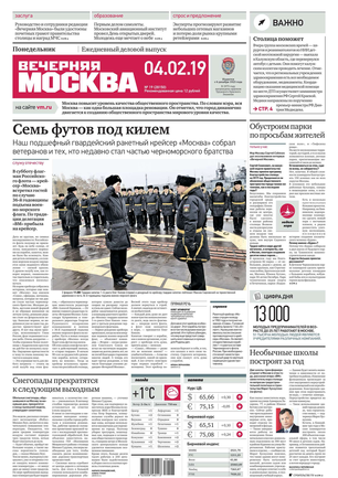 «Вечерняя Москва» — ежедневная российская вечерняя газета, старейшее из вечерних изданий в России, учрежденное в 1923 году. Выходит пять дней в неделю, кроме субботы и воскресенья. Отличается тем, что рассказывает о событиях еще не завершившегося дня. Оперативно освещает хронику и особенности жизни Москвы, охватывает все слои общества и большинство профессиональных и возрастных групп читателей.Издание представлено тремя выпусками – утренним ежедневным, вечерним (выходит три раза в неделю), еженедельным (выходит по четвергам).