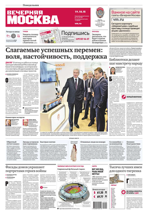 «Вечерняя Москва» — ежедневная российская вечерняя газета, старейшее из вечерних изданий в России, учрежденное в 1923 году. Выходит пять дней в неделю, кроме субботы и воскресенья. Отличается тем, что рассказывает о событиях еще не завершившегося дня. Оперативно освещает хронику и особенности жизни Москвы, охватывает все слои общества и большинство профессиональных и возрастных групп читателей.Издание представлено тремя выпусками – утренним ежедневным, вечерним (выходит три раза в неделю), еженедельным (выходит по четвергам).