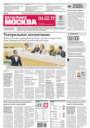 «Вечерняя Москва» — ежедневная российская вечерняя газета, старейшее из вечерних изданий в России, учрежденное в 1923 году. Выходит пять дней в неделю, кроме субботы и воскресенья. Отличается тем, что рассказывает о событиях еще не завершившегося дня. Оперативно освещает хронику и особенности жизни Москвы, охватывает все слои общества и большинство профессиональных и возрастных групп читателей.Издание представлено тремя выпусками – утренним ежедневным, вечерним (выходит три раза в неделю), еженедельным (выходит по четвергам).