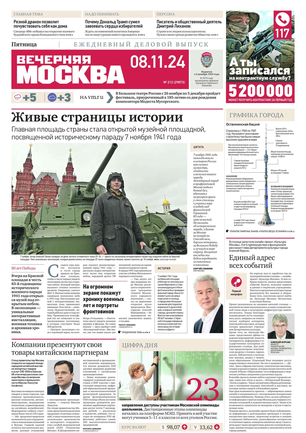 «Вечерняя Москва» — ежедневная российская вечерняя газета, старейшее из вечерних изданий в России, учрежденное в 1923 году. Выходит пять дней в неделю, кроме субботы и воскресенья. Отличается тем, что рассказывает о событиях еще не завершившегося дня. Оперативно освещает хронику и особенности жизни Москвы, охватывает все слои общества и большинство профессиональных и возрастных групп читателей.Издание представлено тремя выпусками – утренним ежедневным, вечерним (выходит три раза в неделю), еженедельным (выходит по четвергам).