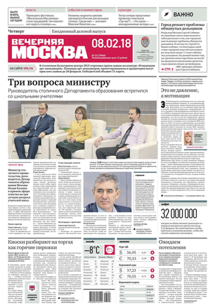 «Вечерняя Москва» — ежедневная российская вечерняя газета, старейшее из вечерних изданий в России, учрежденное в 1923 году. Выходит пять дней в неделю, кроме субботы и воскресенья. Отличается тем, что рассказывает о событиях еще не завершившегося дня. Оперативно освещает хронику и особенности жизни Москвы, охватывает все слои общества и большинство профессиональных и возрастных групп читателей.Издание представлено тремя выпусками – утренним ежедневным, вечерним (выходит три раза в неделю), еженедельным (выходит по четвергам).