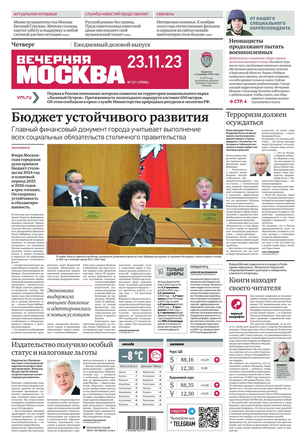 «Вечерняя Москва» — ежедневная российская вечерняя газета, старейшее из вечерних изданий в России, учрежденное в 1923 году. Выходит пять дней в неделю, кроме субботы и воскресенья. Отличается тем, что рассказывает о событиях еще не завершившегося дня. Оперативно освещает хронику и особенности жизни Москвы, охватывает все слои общества и большинство профессиональных и возрастных групп читателей.Издание представлено тремя выпусками – утренним ежедневным, вечерним (выходит три раза в неделю), еженедельным (выходит по четвергам).