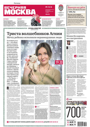 «Вечерняя Москва» — ежедневная российская вечерняя газета, старейшее из вечерних изданий в России, учрежденное в 1923 году. Выходит пять дней в неделю, кроме субботы и воскресенья. Отличается тем, что рассказывает о событиях еще не завершившегося дня. Оперативно освещает хронику и особенности жизни Москвы, охватывает все слои общества и большинство профессиональных и возрастных групп читателей.Издание представлено тремя выпусками – утренним ежедневным, вечерним (выходит три раза в неделю), еженедельным (выходит по четвергам).