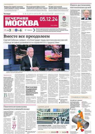«Вечерняя Москва» — ежедневная российская вечерняя газета, старейшее из вечерних изданий в России, учрежденное в 1923 году. Выходит пять дней в неделю, кроме субботы и воскресенья. Отличается тем, что рассказывает о событиях еще не завершившегося дня. Оперативно освещает хронику и особенности жизни Москвы, охватывает все слои общества и большинство профессиональных и возрастных групп читателей.Издание представлено тремя выпусками – утренним ежедневным, вечерним (выходит три раза в неделю), еженедельным (выходит по четвергам).