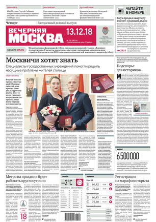 «Вечерняя Москва» — ежедневная российская вечерняя газета, старейшее из вечерних изданий в России, учрежденное в 1923 году. Выходит пять дней в неделю, кроме субботы и воскресенья. Отличается тем, что рассказывает о событиях еще не завершившегося дня. Оперативно освещает хронику и особенности жизни Москвы, охватывает все слои общества и большинство профессиональных и возрастных групп читателей.Издание представлено тремя выпусками – утренним ежедневным, вечерним (выходит три раза в неделю), еженедельным (выходит по четвергам).