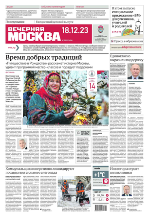 «Вечерняя Москва» — ежедневная российская вечерняя газета, старейшее из вечерних изданий в России, учрежденное в 1923 году. Выходит пять дней в неделю, кроме субботы и воскресенья. Отличается тем, что рассказывает о событиях еще не завершившегося дня. Оперативно освещает хронику и особенности жизни Москвы, охватывает все слои общества и большинство профессиональных и возрастных групп читателей.Издание представлено тремя выпусками – утренним ежедневным, вечерним (выходит три раза в неделю), еженедельным (выходит по четвергам).