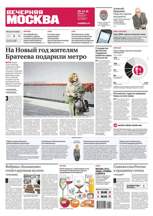 «Вечерняя Москва» — ежедневная российская вечерняя газета, старейшее из вечерних изданий в России, учрежденное в 1923 году. Выходит пять дней в неделю, кроме субботы и воскресенья. Отличается тем, что рассказывает о событиях еще не завершившегося дня. Оперативно освещает хронику и особенности жизни Москвы, охватывает все слои общества и большинство профессиональных и возрастных групп читателей.Издание представлено тремя выпусками – утренним ежедневным, вечерним (выходит три раза в неделю), еженедельным (выходит по четвергам).