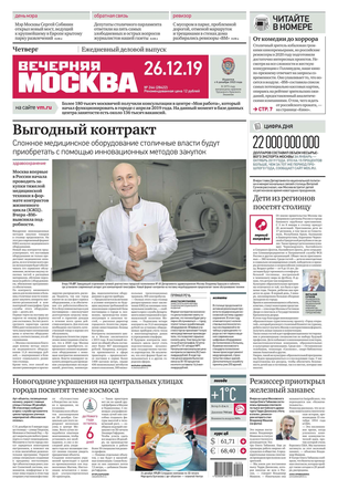 «Вечерняя Москва» — ежедневная российская вечерняя газета, старейшее из вечерних изданий в России, учрежденное в 1923 году. Выходит пять дней в неделю, кроме субботы и воскресенья. Отличается тем, что рассказывает о событиях еще не завершившегося дня. Оперативно освещает хронику и особенности жизни Москвы, охватывает все слои общества и большинство профессиональных и возрастных групп читателей.Издание представлено тремя выпусками – утренним ежедневным, вечерним (выходит три раза в неделю), еженедельным (выходит по четвергам).