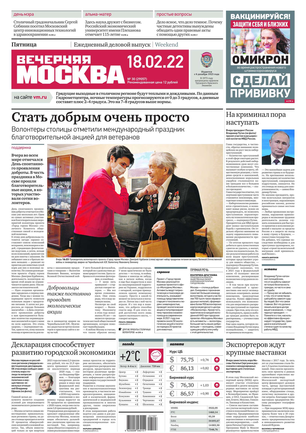«Вечерняя Москва» — ежедневная российская вечерняя газета, старейшее из вечерних изданий в России, учрежденное в 1923 году. Выходит пять дней в неделю, кроме субботы и воскресенья. Отличается тем, что рассказывает о событиях еще не завершившегося дня. Оперативно освещает хронику и особенности жизни Москвы, охватывает все слои общества и большинство профессиональных и возрастных групп читателей.Издание представлено тремя выпусками – утренним ежедневным, вечерним (выходит три раза в неделю), еженедельным (выходит по четвергам).