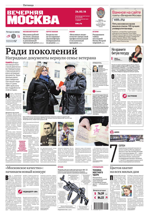 «Вечерняя Москва» — ежедневная российская вечерняя газета, старейшее из вечерних изданий в России, учрежденное в 1923 году. Выходит пять дней в неделю, кроме субботы и воскресенья. Отличается тем, что рассказывает о событиях еще не завершившегося дня. Оперативно освещает хронику и особенности жизни Москвы, охватывает все слои общества и большинство профессиональных и возрастных групп читателей.Издание представлено тремя выпусками – утренним ежедневным, вечерним (выходит три раза в неделю), еженедельным (выходит по четвергам).