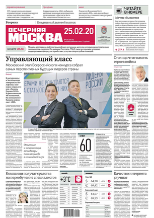 «Вечерняя Москва» — ежедневная российская вечерняя газета, старейшее из вечерних изданий в России, учрежденное в 1923 году. Выходит пять дней в неделю, кроме субботы и воскресенья. Отличается тем, что рассказывает о событиях еще не завершившегося дня. Оперативно освещает хронику и особенности жизни Москвы, охватывает все слои общества и большинство профессиональных и возрастных групп читателей.Издание представлено тремя выпусками – утренним ежедневным, вечерним (выходит три раза в неделю), еженедельным (выходит по четвергам).