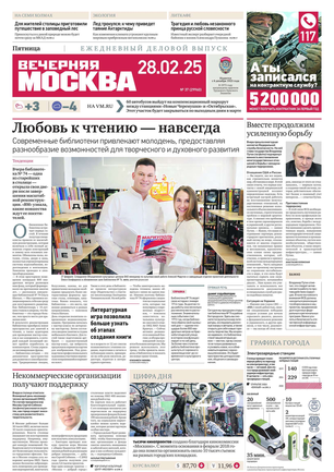 «Вечерняя Москва» — ежедневная российская вечерняя газета, старейшее из вечерних изданий в России, учрежденное в 1923 году. Выходит пять дней в неделю, кроме субботы и воскресенья. Отличается тем, что рассказывает о событиях еще не завершившегося дня. Оперативно освещает хронику и особенности жизни Москвы, охватывает все слои общества и большинство профессиональных и возрастных групп читателей.Издание представлено тремя выпусками – утренним ежедневным, вечерним (выходит три раза в неделю), еженедельным (выходит по четвергам).