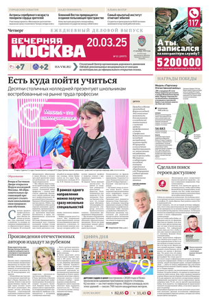 «Вечерняя Москва» — ежедневная российская вечерняя газета, старейшее из вечерних изданий в России, учрежденное в 1923 году. Выходит пять дней в неделю, кроме субботы и воскресенья. Отличается тем, что рассказывает о событиях еще не завершившегося дня. Оперативно освещает хронику и особенности жизни Москвы, охватывает все слои общества и большинство профессиональных и возрастных групп читателей.Издание представлено тремя выпусками – утренним ежедневным, вечерним (выходит три раза в неделю), еженедельным (выходит по четвергам).