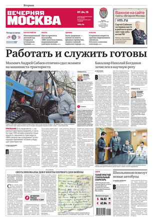 «Вечерняя Москва» — ежедневная российская вечерняя газета, старейшее из вечерних изданий в России, учрежденное в 1923 году. Выходит пять дней в неделю, кроме субботы и воскресенья. Отличается тем, что рассказывает о событиях еще не завершившегося дня. Оперативно освещает хронику и особенности жизни Москвы, охватывает все слои общества и большинство профессиональных и возрастных групп читателей.Издание представлено тремя выпусками – утренним ежедневным, вечерним (выходит три раза в неделю), еженедельным (выходит по четвергам).