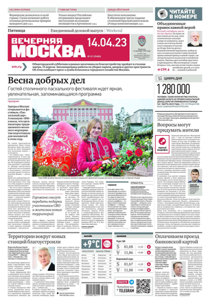 «Вечерняя Москва» — ежедневная российская вечерняя газета, старейшее из вечерних изданий в России, учрежденное в 1923 году. Выходит пять дней в неделю, кроме субботы и воскресенья. Отличается тем, что рассказывает о событиях еще не завершившегося дня. Оперативно освещает хронику и особенности жизни Москвы, охватывает все слои общества и большинство профессиональных и возрастных групп читателей.Издание представлено тремя выпусками – утренним ежедневным, вечерним (выходит три раза в неделю), еженедельным (выходит по четвергам).