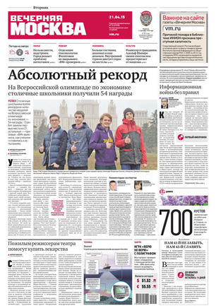 «Вечерняя Москва» — ежедневная российская вечерняя газета, старейшее из вечерних изданий в России, учрежденное в 1923 году. Выходит пять дней в неделю, кроме субботы и воскресенья. Отличается тем, что рассказывает о событиях еще не завершившегося дня. Оперативно освещает хронику и особенности жизни Москвы, охватывает все слои общества и большинство профессиональных и возрастных групп читателей.Издание представлено тремя выпусками – утренним ежедневным, вечерним (выходит три раза в неделю), еженедельным (выходит по четвергам).