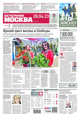 «Вечерняя Москва» — ежедневная российская вечерняя газета, старейшее из вечерних изданий в России, учрежденное в 1923 году. Выходит пять дней в неделю, кроме субботы и воскресенья. Отличается тем, что рассказывает о событиях еще не завершившегося дня. Оперативно освещает хронику и особенности жизни Москвы, охватывает все слои общества и большинство профессиональных и возрастных групп читателей.Издание представлено тремя выпусками – утренним ежедневным, вечерним (выходит три раза в неделю), еженедельным (выходит по четвергам).