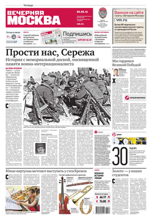«Вечерняя Москва» — ежедневная российская вечерняя газета, старейшее из вечерних изданий в России, учрежденное в 1923 году. Выходит пять дней в неделю, кроме субботы и воскресенья. Отличается тем, что рассказывает о событиях еще не завершившегося дня. Оперативно освещает хронику и особенности жизни Москвы, охватывает все слои общества и большинство профессиональных и возрастных групп читателей.Издание представлено тремя выпусками – утренним ежедневным, вечерним (выходит три раза в неделю), еженедельным (выходит по четвергам).