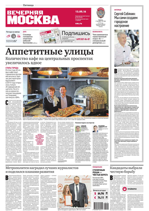 «Вечерняя Москва» — ежедневная российская вечерняя газета, старейшее из вечерних изданий в России, учрежденное в 1923 году. Выходит пять дней в неделю, кроме субботы и воскресенья. Отличается тем, что рассказывает о событиях еще не завершившегося дня. Оперативно освещает хронику и особенности жизни Москвы, охватывает все слои общества и большинство профессиональных и возрастных групп читателей.Издание представлено тремя выпусками – утренним ежедневным, вечерним (выходит три раза в неделю), еженедельным (выходит по четвергам).