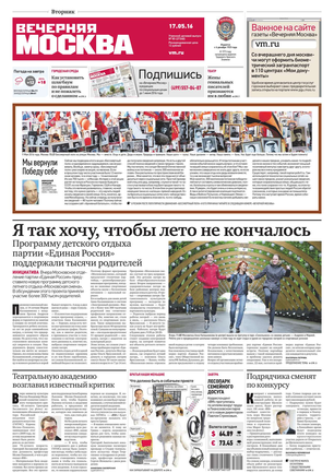 «Вечерняя Москва» — ежедневная российская вечерняя газета, старейшее из вечерних изданий в России, учрежденное в 1923 году. Выходит пять дней в неделю, кроме субботы и воскресенья. Отличается тем, что рассказывает о событиях еще не завершившегося дня. Оперативно освещает хронику и особенности жизни Москвы, охватывает все слои общества и большинство профессиональных и возрастных групп читателей.Издание представлено тремя выпусками – утренним ежедневным, вечерним (выходит три раза в неделю), еженедельным (выходит по четвергам).