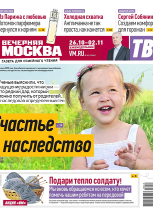 Еженедельный выпуск «Вечерней Москвы» — это значимые события недели, афиша города, новости из сферы отдыха и развлечений, телепрограмма с анонсами и комментариями, авторские колонки журналистов и авторитетные мнения экспертов, детская страничка, специальная рубрика «Золушка», интересные репортажи о необычных судьбах московских жителей, постоянные конкурсы и викторины.