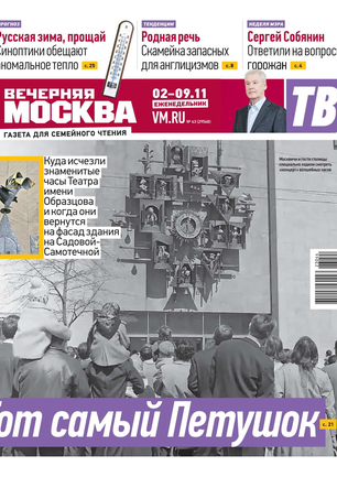 Еженедельный выпуск «Вечерней Москвы» — это значимые события недели, афиша города, новости из сферы отдыха и развлечений, телепрограмма с анонсами и комментариями, авторские колонки журналистов и авторитетные мнения экспертов, детская страничка, специальная рубрика «Золушка», интересные репортажи о необычных судьбах московских жителей, постоянные конкурсы и викторины.