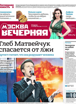 «Вечерняя Москва» — ежедневная российская вечерняя газета, старейшее из вечерних изданий в России, учрежденное в 1923 году. Выходит пять дней в неделю, кроме субботы и воскресенья. Отличается тем, что рассказывает о событиях еще не завершившегося дня. Оперативно освещает хронику и особенности жизни Москвы, охватывает все слои общества и большинство профессиональных и возрастных групп читателей.Издание представлено тремя выпусками – утренним ежедневным, вечерним (выходит три раза в неделю), еженедельным (выходит по четвергам).
