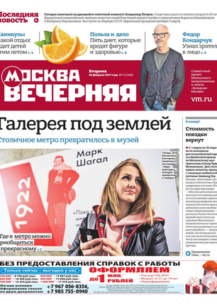 «Вечерняя Москва» — ежедневная российская вечерняя газета, старейшее из вечерних изданий в России, учрежденное в 1923 году. Выходит пять дней в неделю, кроме субботы и воскресенья. Отличается тем, что рассказывает о событиях еще не завершившегося дня. Оперативно освещает хронику и особенности жизни Москвы, охватывает все слои общества и большинство профессиональных и возрастных групп читателей.Издание представлено тремя выпусками – утренним ежедневным, вечерним (выходит три раза в неделю), еженедельным (выходит по четвергам).